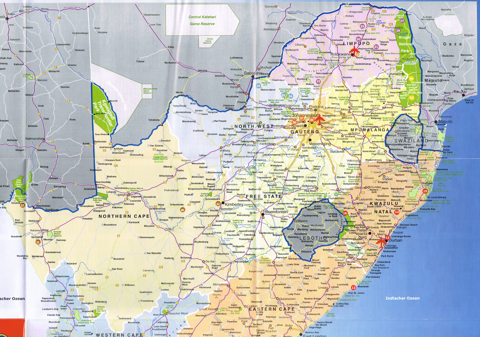 Im Nord-Osten liegen Swaziland, Mozambique und im Norden Botswana, Namibia sowie Zimbabwe.